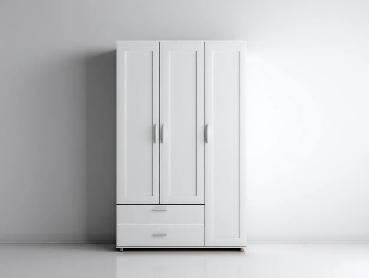 Este armario de tres puertas está diseñado para dormitorios y otros espacios interiores, ofreciendo una solución práctica para el almacenamiento diario de ropa y objetos personales. Su estructura vertical permite mantener el espacio ordenado y bien organizado.