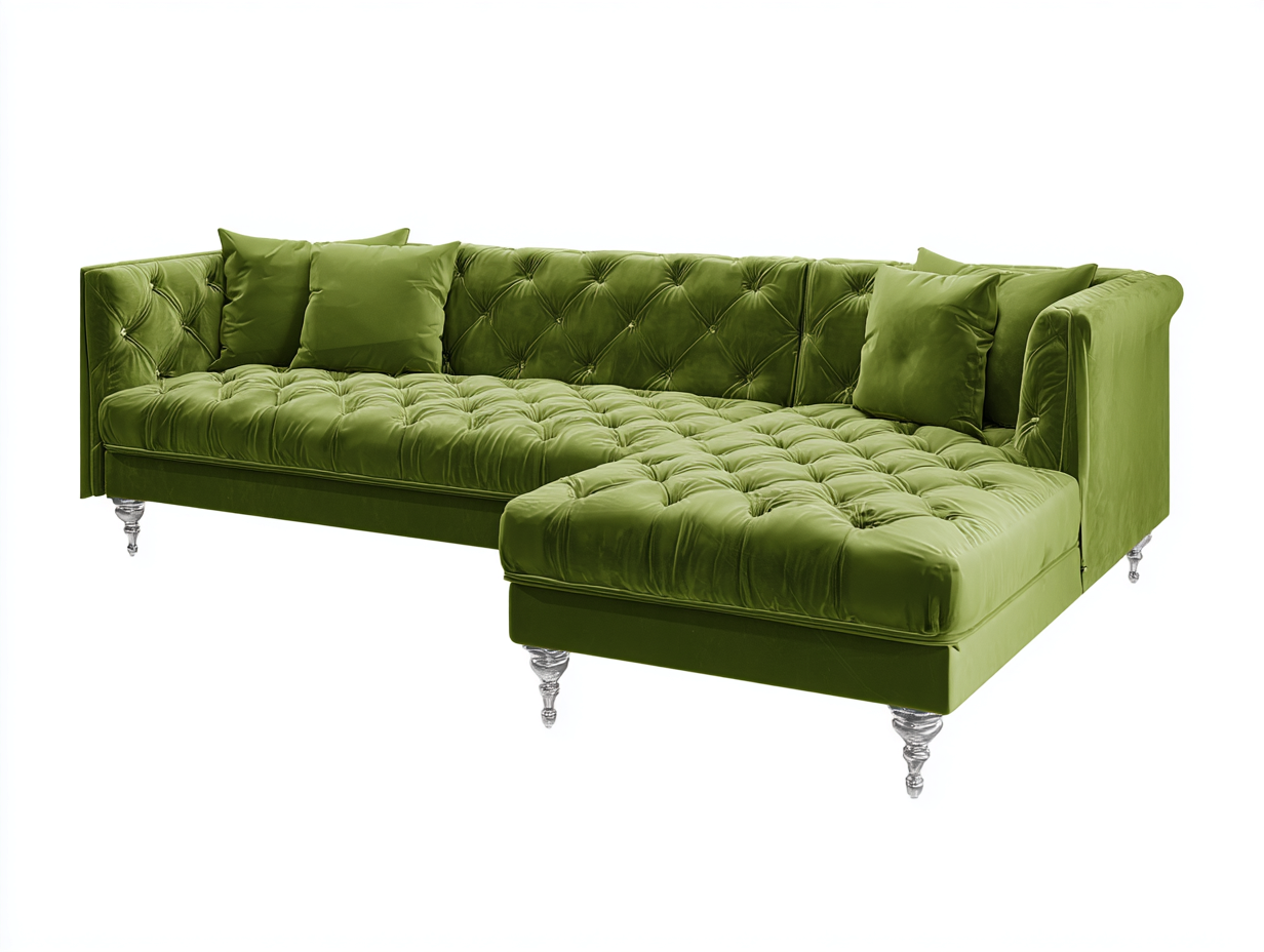 Estructura sólida con tapizado en terciopelo de color verde, suave al tacto y con un acabado acolchado que realza su estética. Las patas decorativas aportan estabilidad y un toque distintivo.